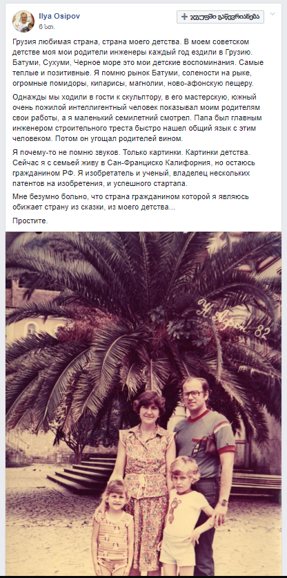 ახლა, ოჯახთან ერთად, სან-ფრანცისკოში ვცხოვრობ, თუმცა რუსეთის მოქალაქე ვარ. მე გამომგონებელი და მეცნიერი ვარ, რამდენიმე პატენტისა და გამოგონების, ასევე წარმატებული სტარტაპის მფლობელი და ძალიან მტკივა, რომ ის ქვეყანა, რომლის მოქალაქეც ვარ, ჩემი ბავშვობის ზღაპრულ ქვეყანას ემტერება. მაპატიეთ!”- წერს ოსიპოვი.