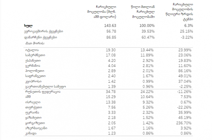 წარმოდგენილი მონაცემებით ირკვევა, რომ ყველაზე მეტი თანხა – 34.78 მილიონი აშშ დოლარი საქართველოში რუსეთიდან გადმოირიცხა. თუმცა, გასული წლის ივნისთან შედარებით, თანხის მოცულობა 11 პროცენტითაა შემცირებული.