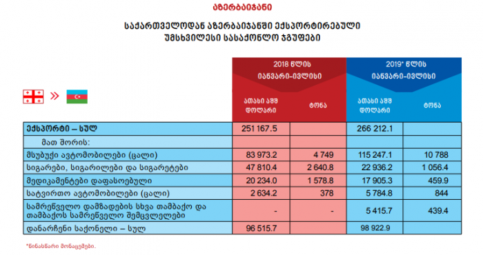 ყველაზე დიდი თანხა საქართველომ აზერბაიჯანში ავტომობილების რეექსპორტით მიიღო – 115. 247 მლნ.აშშ.დოლარი. ყველაზე დიდი რაოდენობით კი ნავთობპოდუქტების შესაძენად დახარჯა – 173 644 მლნ.აშშ დოლარი. სრული სტატისტიკა ასე გამოიყურება: