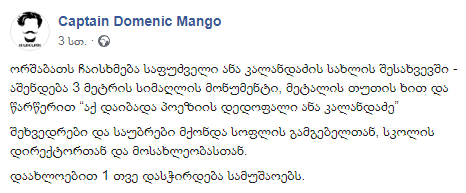 „ორშაბათს ჩაისხმება საფუძველი ანა კალანდაძის სახლის შესახვევში – აშენდება 3 მეტრის სიმაღლის ლითონის მონუმენტი თუთის ხით, რომელსაც ექნება წარწერა – „აქ დაიბადა პოეზიის დედოფალი – ანა კალანდაძე“. შეხვედრები და საუბრები მქონდა სოფლის გამგებელთან, სკოლის დირექტორთან და მოსახლეობასთან.