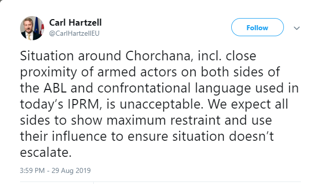 „ჩორჩანას გარშემო შექმნილი სიტუაცია, მათ შორის ადმინისტრაციული სასაზღვრო ხაზის ორივე მხარის გასწვრივ შეიარაღებული პირების სიახლოვე და ინციდენტების პრევენციისა და მათზე რეაგირების მექანიზმის შეხვედრაზე გამოყენებული კონფრონტაციული ენა, მიუღებელია. ჩვენ ველოდებით, რომ ყველა მხარე გამოიჩენს მაქსიმალურ თავშეკავებულობას და გამოიყენებს თავის გავლენას იმის უზრუნველსაყოფად, რომ ვითარების ესკალაცია არ მოხდეს“, – წერს კარლ ჰარცელი.