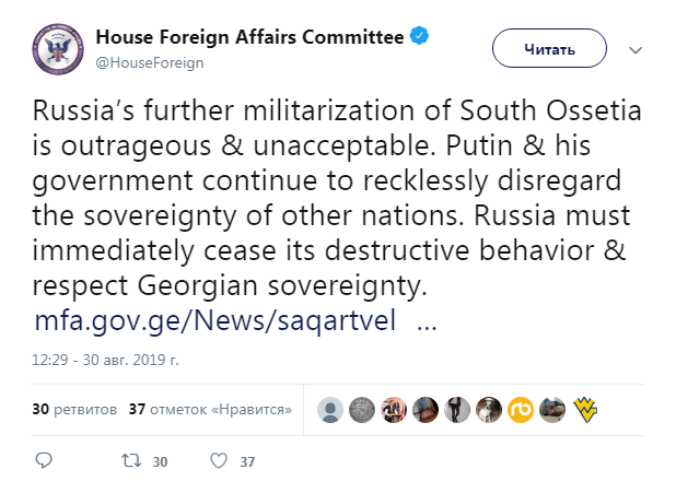 „რუსეთის მიერ სამხრეთ ოსეთის მილიტარიზაცია შემაშფოთებელი და მიუღებელია. პუტინი და მისი მთავრობა სხვა ერების სუვერენიტეტის უგუნურ უგულებელყოფას განაგრძობენ. რუსეთმა დაუყოვნებლივ უნდა შეწყვიტოს დესტრუქციული ქმედება და პატივი სცეს საქართველოს სუვერენიტეტს“, – აღნიშნულია აშშ-ის კონგრესის წარმომადგენელთა პალატის საგარეო ურთიერთობათა კომიტეტის განცხადებაში.