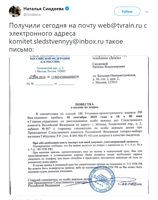„უწყება ფეიკი არ არის. დაკითხვაზე მივდივარ“, – დაწერა სინდეევამ Twitter-ის გვერდზე.
