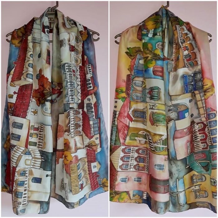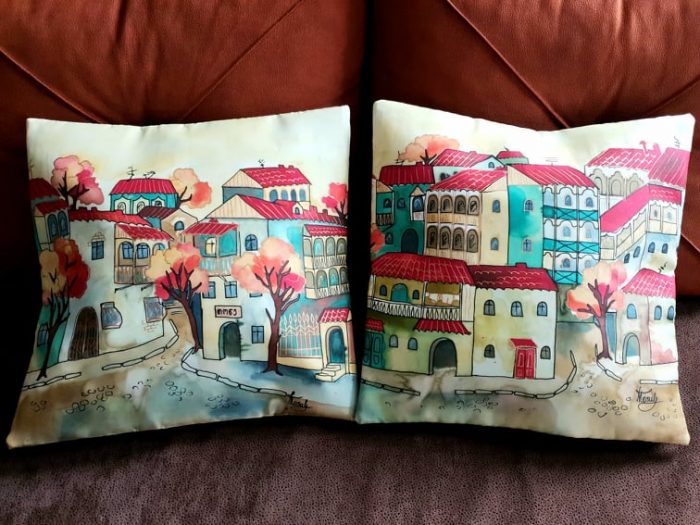 ასევე აქტიურად ვხატავ აბრეშუმის ბალიშის პირებს და შარფებს. გეგმაში მაქვს მაგიდის ხელსახოცების მოხატვაც.