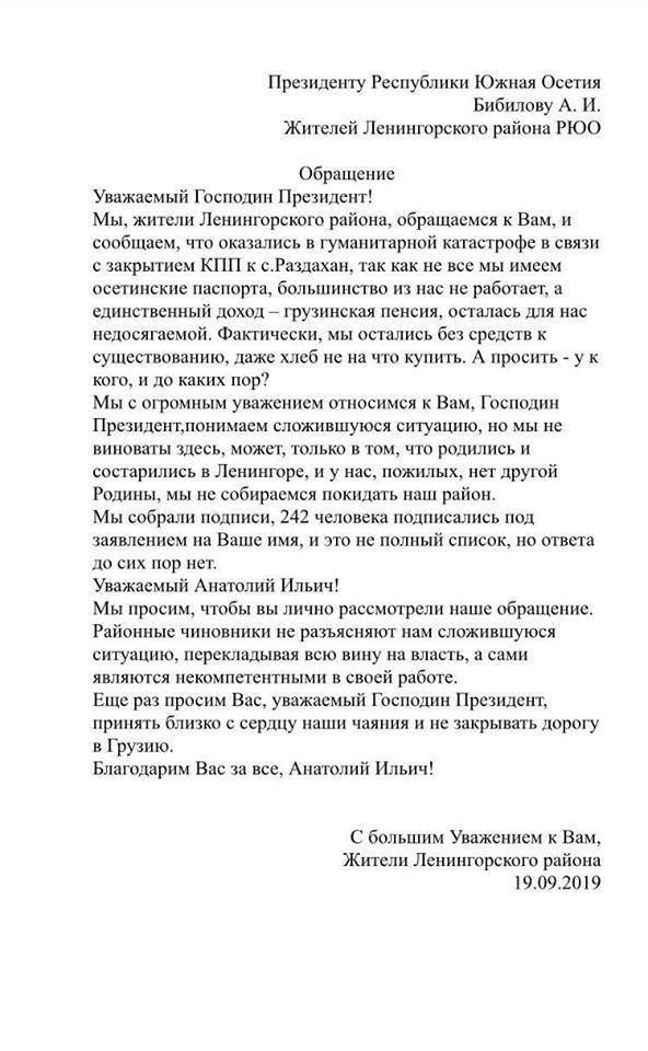 „ჩვენ „ლენინგორის“ მოსახლეობა მოგმართავთ თქვენ, ბატონო პრეზიდენტო და გაცნობებთ, რომ საკონტროლო გამშვები პუნქტის ჩაკეტვის გამო, ჰუმანიტარული კატასტროფის წინაშე აღმოვჩნდით, რადგან ყველას არ გაგვაჩნია ოსეთის პასპორტები, უმრავლესობა არ ვმუშაობთ, ერთადერთი შემოსავალი კი, საქართველოს პენსია, ჩვენთვის მიუწვდომელი გახდა. ფაქტობრივად, საარსებოდ საჭირო სახსრების გარეშე დავრჩით. ვის ვთხოვოთ და როდემდე?