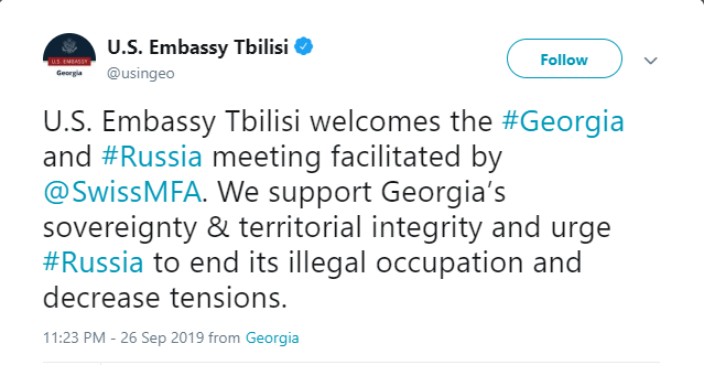 „საქართველოში ამერიკის საელჩო საქართველოსა და რუსეთს შორის შეხვედრას მიესალმება, რომელიც შვეიცარიის შუამავლობით შედგა. ჩვენ მხარს ვუჭერთ საქართველოს სუვერენიტეტსა და ტერიტორიულ მთლიანობას და მოვუწოდებთ რუსეთს, შეაჩეროს უკანონო ოკუპაცია და შეამციროს დაძაბულობა“, – ნათქვამია განცხადებაში.