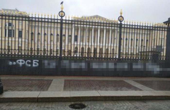 სანქტ-პეტერბურგში 42 წლის იგორ სოკოლოვი დააკავეს, რომელმაც რუსეთის მუზეუმის ჭიშკარზე ვლადიმირ პუტინის და ფსბ-ს შესახებ შეურაცხმყოფელი შინაარსის წარწერა გააკეთა.