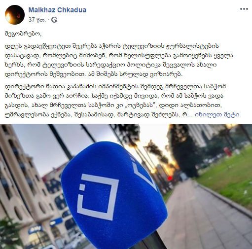 “მეგობრებო, დღეს გადავწყვიტეთ შეკრება აჭარის ტელევიზიის ჟურნალისტების დასაცავად, რომლებიც შიშობენ , ხელისუფლება გამოიყენებს ყველა ხერხს, რომ ტელევიზიის სარედაქციო პოლიტიკა ახალი დირექტორის მეშვეობით შეცვალოს. ამ შიშებს სრულად ვიზიარებ. დირექტორი – ნათია კაპანაძის იმპიჩმენტის შემდეგ მრჩეველთა საბჭომ მიზეზთა გამო ვერ აირჩია. საქმე იქამდე მივიდა, რომ ამ საბჭოს ვადა გასდის, ახალ მრჩეველთა საბჭოში კი “ოცნებას”, დიდი ალბათობით უმრავლესობა ექნება, შესაბამისად, მარტივად შეძლებს, რომ დანიშნოს (შერჩევას მაგ პროცესს ვერ დავარქმევ) ისეთი დირექტორი, რომელიც რადიკალურად შეცვლის, უპირველეს ყოვლისა, სარედაქციო დამოუკიდებლობას, რომელიც ყველაზე დიდი მონაპოვარია ამ ტელევიზიის ჯერ ნათია კაპანაძის დირექტორობის, შემდეგ კი ნათია ზოიძის დირექტორობის მოვალეობის შესრულების პერიოდში – ეს არის მთელი გუნდის დამსახურება და ძალიან მარტივად ჩამოიშლება ყველაფერი, თუ ხელისუფლებას არ გავაგონეთ ჩვენი ხმა – ტელევიზია ეკუთვნის საზოგადოებას და არა ხელისუფლებას. ამიტომ გელოდებით ყველას, ევროპის მოედანზე, დღეს 8 საათზე – აჭარის საზოგადოებრივი მაუწყებლის მხარდასაჭერად!”,-წერს მალხაზ ჭკადუა.