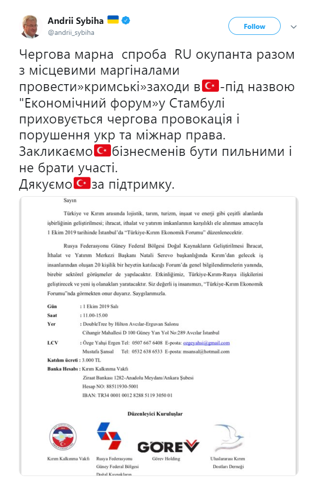 უკრაინის ელჩი მოუწოდებს თურქ ბიზნესმენებს ყურადღებით იყვნენ და ფორუმში მონაწილეობა არ მიიღონ.
