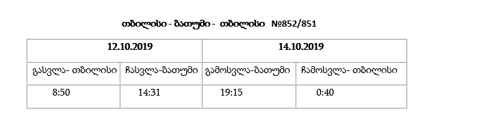 გაზრდილი მგზავრთნაკადის მომსახურების მიზნით, 12 ოქტომბერს თბილისიდან და 14 ოქტომბერს ბათუმიდან “საქართველოს რკინიგზა“ დამატებით რეისებს ნიშნავს.