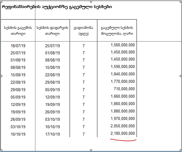 ახალგაზრდა ფინანსისტთა და ბიზნესმენთა ასოციაციის ვიცე- პრეზიდენტს პაატა ბაირახტარს ამის საილუსტრაციოდ ეროვნული ბანკის მიერ რეფინანსირების აუქციონზე კომერციულ ბანკებზე გაცემული სესხების სტატისტიკა მოჰყავს.