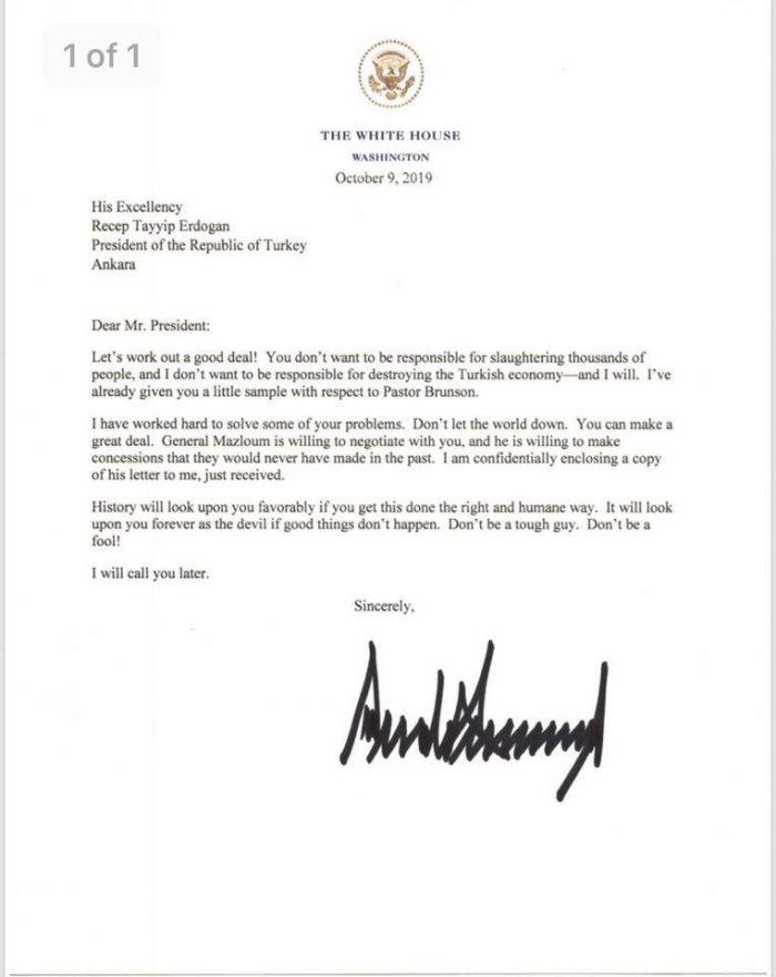 აშშ-ის პრეზიდენტმა დონალდ ტრამპმა თურქ კოლეგას რეჯეპ თაიფ ერდოღანს 9 ოქტომბერს სირიაში სამხედრო ოპერაციის დაწყებამდე წერილი მისწერა.