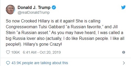“ისევ არაკეთილსინდისიერი ჰილარი კლინტონი. მან კონგრესმენ ტულსი გაბარდს რუსეთის ფავორიტი, ჯილ სტეინს კი რუსეთის აგენტი უწოდა. შესაძლოა, გსმენიათ, რომ მეც მიწოდეს რუსეთის დიდი მოყვარული (მე მომწონს რუსი ხალხი, მე ყველა ხალხი მომწონს!) ჰილარი გაგიჟდა“, – წერს აშშ-ის პრეზიდენტი.