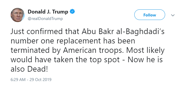 „ახლახანს დაადასტურეს, რომ აბუ ბაქრ ალ-ბაღდადის პირველი მემკვიდრე განადგურებულია ამერიკული ჯარების მიერ. დიდი ალბათობით, ის დაიკავებდა უმაღლეს პოსტს. ახლა ისიც მკვდარია“, – დაწერა ტრამპმა.