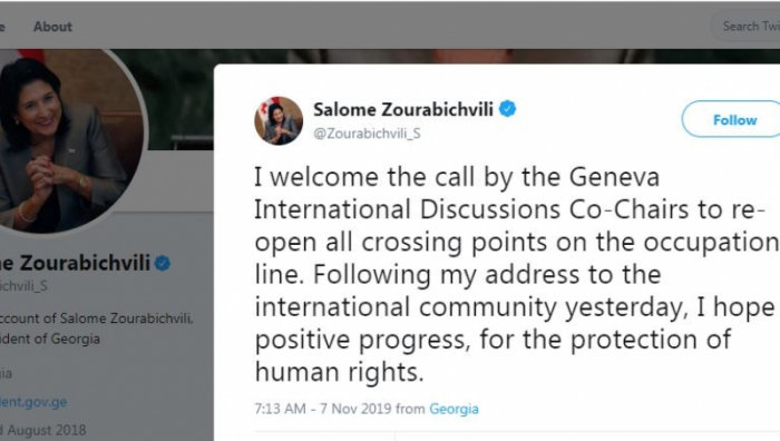 საოკუპაციო ხაზზე გამშვები პუნქტების გახსნასთან დაკავშირებით ჟენევის დისკუსიების თანათავმჯდომარეების მიერ გავრცელებულ განცხადებას საქართველოს პრეზიდენტი, სალომე ზურაბიშვილი “twitter”-ზე გამოეხმაურა. ზურაბიშვილს ადამიანის უფლებათა დაცვის საქმეში პოზიტიური წინსვლის იმედი აქვს.