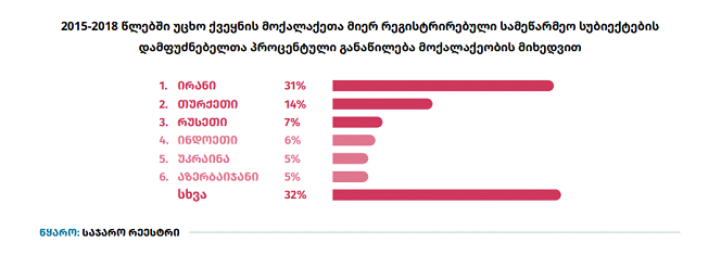 უცხო ქვეყნის მოქალაქეებიდან, ყველაზე მეტი ბიზნესკომპანია, საქართველოში ირანის მოქალაქეებმა დააფუძნეს. ოფიციალური სტატისტიკის თანახმად, უცხო ქვეყნის მოქალაქეთა მიერ საქართველოში რეგისტრირებული სამეწარმეო სუბიექტების ნახევარზე მეტი ირანის, თურქეთისა და რუსეთის მოქალაქეების მიერაა დაფუძნებული.