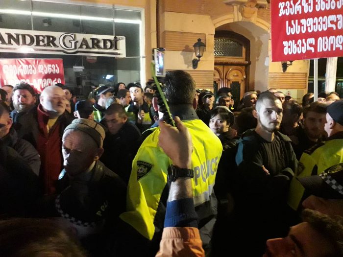 აქციის მონაწილეები კინოთეატრ “აპოლოს” კვერცხებს ესვრიან