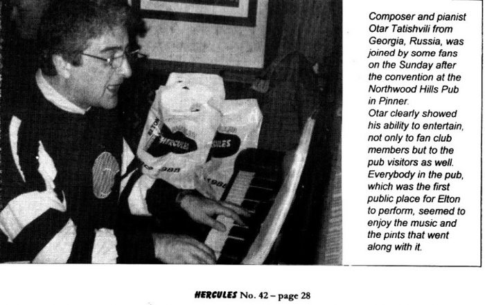 ღერა „Happy birthday dear Elton“, ბუნებრივია, ელტონს ეძღვნებოდა და საღამოზე, რომელიც გაიმართა, სტუმრების მიღება ელტონისადმი მიძღვნილი ჩემი სიმღერის შესავლის ფონზე ხდებოდა. ცხადია, ეს ძალიან სასიამოვნო შტრიხი იყო ჩემთვის. აქვე შევხვდი ელტონ ჯონის ფანკლუბის ხელმძღვანელს ჯორჯ მეტლოკს, გადავეცი ჩემი ახალი ჩანაწერების დისკი და მათ შორის ელტონისადმი მიძღვნილი ეს სიმღერაც, რა თქმა უნდა.