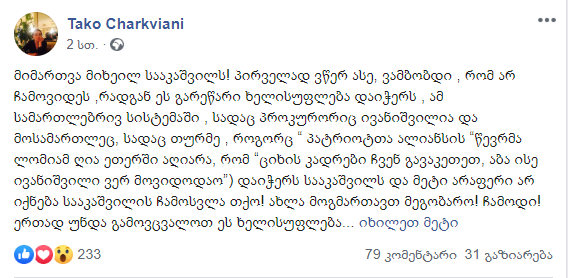 „მიმართვა მიხეილ სააკაშვილს! პირველად ვწერ ასე, ვამბობდი, რომ არ ჩამოვიდეს, რადგან ეს გარეწარი ხელისუფლება დაიჭერს, ამ სამართლებრივ სისტემაში, სადაც პროკურორიც ივანიშვილია და მოსამართლეც, სადაც თურმე, როგორც “პატრიოტთა ალიანსის“ წევრმა ლომიამ ღია ეთერში აღიარა, რომ “ციხის კადრები ჩვენ გავაკეთეთ, აბა ისე ივანიშვილი ვერ მოვიდოდაო”) დაიჭერს სააკაშვილს და მეტი არაფერი არ იქნება სააკაშვილის ჩამოსვლა თქო!