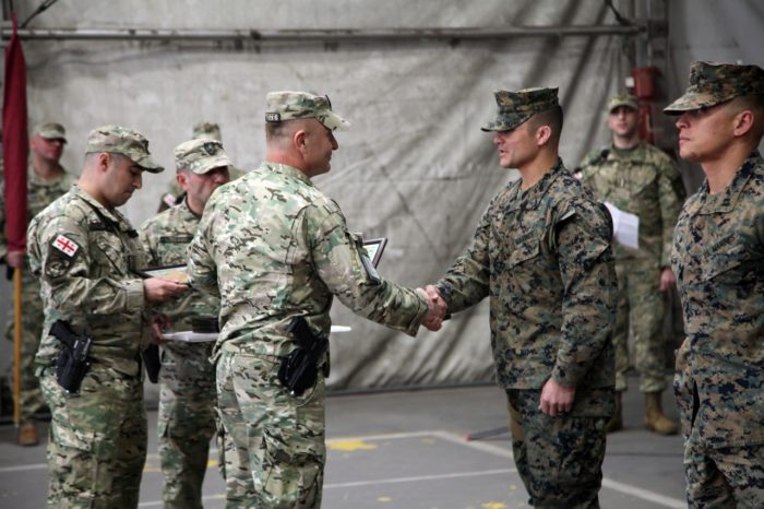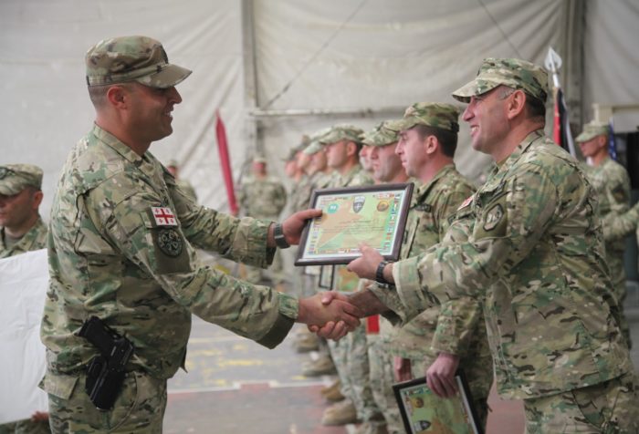 სამშვიდობო მისიის ოფიციალური გადაბარების ცერემონიალზე შესრულდა საქართველოს, აშშ-ის და ავღანეთის ეროვნული ჰიმნები. ღონისძიების დასასრულს დაჯილდოების ცერემონიალი გაიმართა. უწყების ცნობით, ავღანეთში საქართველოს თავდაცვის ძალების უფროსმა სამხედრო წარმომადგენელმა, პოლკოვნიკმა ზაქარია კალანდაძემ, თავდაცვის ძალების სამხედრო წარმომადგენლობის სერჟანტმა, მთავარმა სერჟანტმა გიორგი გოგოჭურმა და 43-ე ბატალიონის მეთაურმა, ვიცე-პოლკოვნიკმა ლაშა დავითაძემ 43-ე ბატალიონის სამხედრო მოსამსახურეები და ქართული სამეკავშირეო ჯგუფის ამერიკელი საზღვაო ქვეითები სამშვიდობო მისიის მედლებითა და სხვადასხვა სიმბოლური საჩუქრებით დააჯილდოვეს. საქართველოს თავდაცვის მინისტრის ბრძანებით კი, 43-ე ბატალიონის მეთაური, ვიცე-პოლკოვნიკი ლაშა დავითაძე უწყებრივი მედლით “სამშობლოსათვის თავდადებული” დაჯილდოვდა.