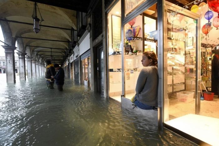 ქალაქის წმინდა მარკის სახელობის ცენტრალური მოედანი დატბორილია და ტურისტებისთვის არის დაკეტილი.