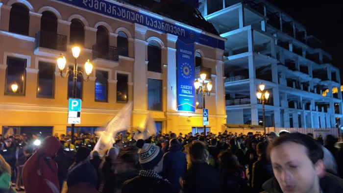 საპროტესტო აქციის მონაწილეთა ნაწილი “ქართული ოცნების“ ოფისთან იმყოფება. ისინი პარლამენტის შენობიდან პარტიის ოფისისკენ მსვლელობით გაემართნენ.