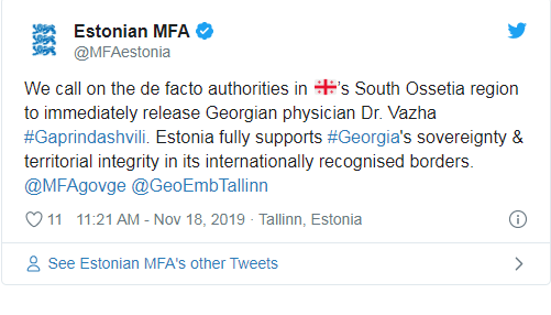 “სამხრეთ ოსეთის დე ფაქტო ხელისუფლებას მოვუწოდებთ სასწრაფოდ გაათავისუფლონ ქართველი ექიმი ვაჟა გაფრინდაშვილი. ესტონეთი სრულად მხარს უჭერს საქართველოს ტერიტორიულ მთლიანობასა და სუვერენიტეტს”, – ნათქვამია განცხადებაში.