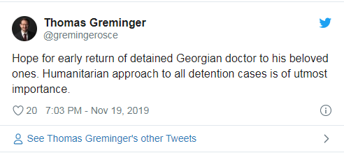 “ვიმედოვნებ, რომ დაკავებული ქართველი ექიმი მალე დაუბრუნდება თავის საყვარელ ადამიანებს. დაკავების თითოეული საქმისადმი ჰუმანიტარული მიდგომა უკიდურესად მნიშვნელოვანია”, – წერს ტომას გრემინგერი.