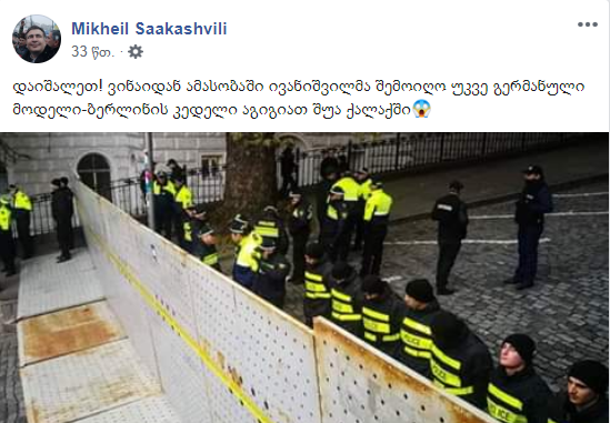 „დაიშალეთ! ამასობაში ივანიშვილმა უკვე შემოიღო გერმანული მოდელი – ბერლინის კედელი აგიგიათ შუა ქუჩაში“, – წერს მიხეილ სააკაშვილი ფეისბუქზე.