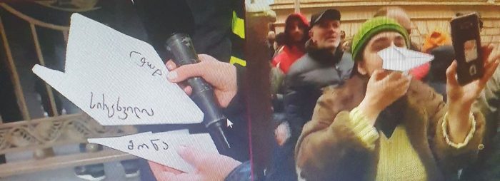 რუსთაველის გამზირზე, პარლამენტის მიმდებარე ტერიტორიაზე, სადაც აქცია მიმდინარეობს აქტივისტებმა საკანონმდებლო ორგანოს ეზოს მიმართულებით ქაღალდის თვითმფრინავები გაუშვეს წარწერით – “მონა” და “სირცხვილია”.