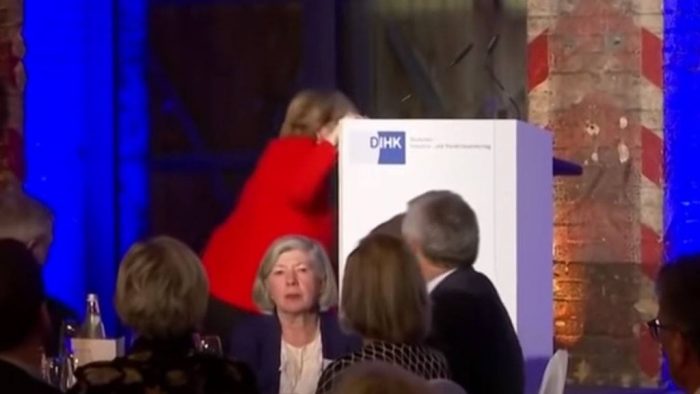 გერმანიის კანცლერი ანგელა მერკელი, ბერლინში სავაჭრო-სამრეწველო პალატის ფედერალურ კრებაზე სიტყვით გამოსვლამდე, სცენაზე ასვლის დროს დაეცა.