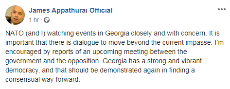 კავკასიასა და ცენტრალურ აზიაში ნატო-ს გენერალური მდივანი ჯეიმს აპატურაი საქართველოში განვითარებულ მოვლენებს სოციალური ქსელის მეშვეობით ეხმაურება.