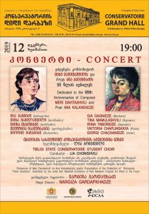12 დეკემბერს, 19:00 საათზე, თბილისის სახელმწიფო კონსერვატორიაში, კომპოზიტორ მერი დავითაშვილისა და პოეტ ანა კალანდაძის 95 წლის საიუბილეო თარიღისადმი მიძღვნილი კონცერტი გაიმართება.
