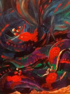 თითქოს უნდა ითრგუნებოდე, მაგრამ პირიქით ხდება… და ეს აშკარად „სვეტიცხოვლის“ ძალა და მადლია. ახლაც არ ვიცი, რატომ დავხატე თევზები… ფერადი თევზი, თითქოს ოქროს თევზი იყო, თითქოს ადამიანების ოცნებები ანათებდა მის ფარფლებში და გაყურსული ფიქრობდა, რომელი ნატვრა აესრულებინა პირველად.