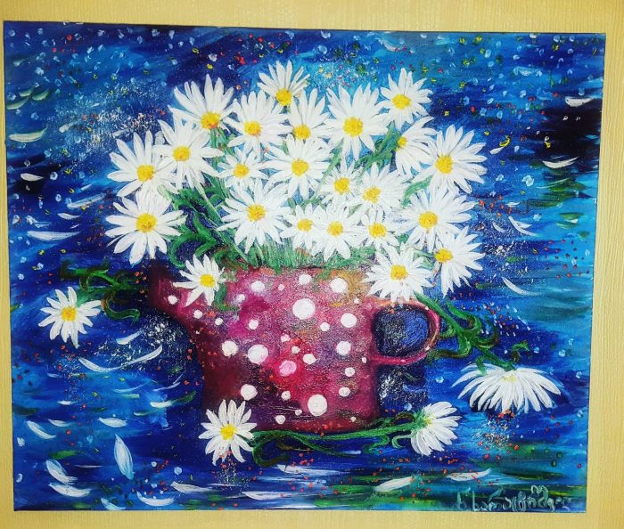 – ჩემი პირველი ნამუშევარი იყო „ნატვრის ხე“. ამ ნახატს მოჰყვა უამრავი, 60-მდე ტილო. მქონდა ბევრი ჯგუფური გამოფენა. აქედან გამოვარჩევდი 8 მარტის გამოფენას, სადაც ნამუშევრით – „წარმატებული ქალი“ ვმონაწილეობდი. 8 მარტის ჯგუფური გამოფენის კატალოგში სწორედ ეს სურათი შევიდა, ახალი გამოფენის კატალოგში 4 ტილოთი და ავტობიოგრაფიით მოვხვდი.