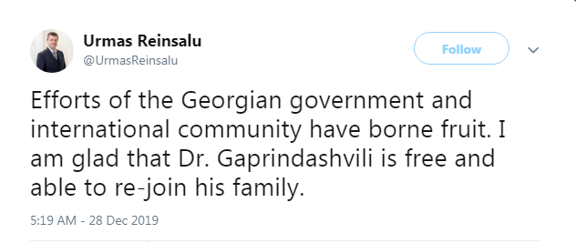 ესტონეთის საგარეო საქმეთა მინისტრი ურმას რეინსალუმი ექიმ ვაჟა გაფრინდაშვილის გათავისუფლებას სოციალურ ქსელ „ტვიტერში“ ეხმაურება. როგორც მან აღნიშნა, საქართველოს ხელისუფლების და საერთაშორისო საზოგადოების ძალისხმევამ შედეგი გამოიღო.