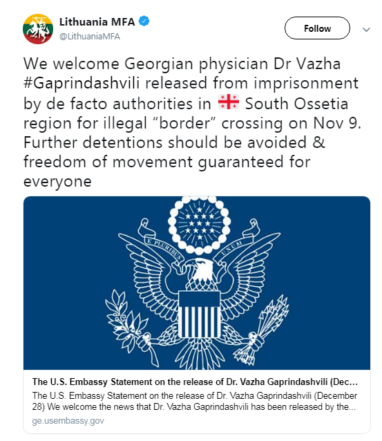 „მივესალმებით სამხრეთ ოსეთის რეგიონის დე ფაქტო მთავრობის პატიმრობიდან ექიმ ვაჟა გაფრინდაშვილის გათავისუფლებას, რომელიც 9 ნოემბერს „საზღვრის“ უკანონო კვეთისთვის დააკავეს. მომავალში მსგავსი ტიპის დაკავებები არ უნდა მოხდეს და ყველასთვის თავისუფალი გადაადგილება გარანტირებული უნდა იყოს“, – აღნიშნულია ლიეტუვის საგარეო საქმეთა სამინისტროს „ტვიტერის“ გვერდზე.