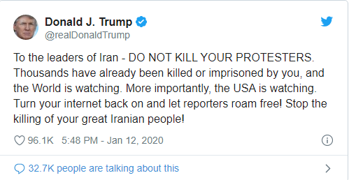 „მივმართავ ირანის ლიდერებს – არ მოკლათ აქციის მონაწილეები. ათასობით ადამიანი უკვე მოკალით ან დააპატიმრეთ და მსოფლიო გაკვირდებათ. ჩართეთ ინტერნეტი და მიეცით აქციის მონაწილეებს საშუალება, გამოხატონ საკუთარი აზრი თავისუფლად. შეწყვიტეთ დიდი ირანელი ხალხის მკვლელობა“,- წერს ტრამპი.