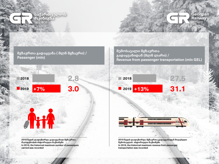 “2019 წელს სამგზავრო გადაყვანებში ისტორიული მაჩვენებლები დაფიქსირდა – საქართველოს რკინიგზის მეშვეობით გადაყვანილია 3 მილიონზე მეტი მგზავრი. შემოსავალმა კი 31 მილიონ ლარს გადააჭარბა”,-ნათქვამია საქართველოს რკინიგზის მიერ გავრცელებულ განცხადებაში.