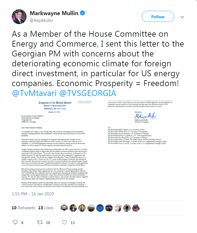 ამის გათვალისწინებით, მე ვუერთდები კონგრესში ჩემი კოლეგების, საქართველოს მეგობართა ჯგუფის თავმჯდომარებიის, ადამ კინზინგერისა და გარი კონოლის, 13 დეკემბრით დათარიღებულ წერილს თქვენს სახელზე, რომელიც დაპირებული დემოკრატიული რეფორმის ჩაგდების გადაწყვეტილებაზე გამოთქმულ წუხილსა და ამასთან დაკავშირებული პროტესტის წინააღმდეგ გამოყენებულ ძალადობაზე შეშფოთებას ეხებოდა. მიუხედავად იმ პროგრესისა, რომელსაც საქართველომ 1991 წელს დამოუკიდებლობის გამოცხადების შემდეგ მიაღწია, ბოლო წლების განმავლობაში დემოკრატიული და თავისუფალი საბაზრო ეკონომიკის ინდიკატორებში განგრძობადი უარყოფითი ტრენდი გამოვლინდა, რომელიც აშშ-ში შეუმჩნეველი არ დარჩენილა. ამის შედეგია საქართველოში პირდაპირი უცხოური ინვესტიციის შემცირება, რადგან ამერიკული და ევროპული ბიზნესინტერესები საქართველოში შევიწროებასა და ექსპროპრიაციის მიზნით, თავდასხმებს დაექვემდებარნენ. ამის შესანიშნავი მაგალითია ნავთობისა და გაზის კომპანია “Frontera Resources” ტეხასიდან. მეტიც, ამერიკული სოციალური მედიის კომპანია “Facebook”-მა განაცხადა, რომ მან ახლახანს დახურა ფართო ქსელი ანგარიშებისა, რომლებიც პარტია “ქართულ ოცნებასთან” იყვნენ დაკავშირებულები და როგორც აღმოჩნდა, ჩართულები იყვნენ კოორდინირებულ, არაავთენტურ ქცევაში იმისთვის, რომ ჩაეხშოთ ოპოზიციური შეხედულებები საქართველოში და გაევრცელებინათ ანტიდასავლური განწყობები, განსაკუთრებით, აშშ-ის წინააღმდეგ. ასეთი გაუარესებადი გარემო იმაზეც აისახა, რომ როგორც წარმომადგენელთა პალატამ, ასევე სენატმა მიიღო და პრეზიდენტმა დაამტკიცა ზედიზედ ორი, ყოველწლიური საბიუჯეტო კანონი 2019 და 2020 წლებისთვის, რომლებიც საქართველოს მთავრობის პროგრესირებად მტრულ ქმედებებზე დემოკრატიული ღირებულებების, თავისუფალი საბაზრო პრინციპებისა და ამერიკული ბიზნესინტერესების წინააღმდეგ წუხილებს ასახავდა. პირველად საქართველოს თანამედროვე ისტორიის განმავლობაში, თქვენი ქვეყანა აშშ-ის საბიუჯეტო კანონებზე მსჯელობისას უარყოფით შუქზე და სიფრთხილით განიხილებოდა. იმ უარყოფითი ტენდენციიდან გამომდინარე, რომელიც მე აღვწერე და ამ ტენდენციის შეჩერების ხელშესაწყობად, გაიზარდა შეშფოთების გაჟღერება და ასევე მოწოდებები სანქციებისა და სხვა სადამსჯელო ზომების შესახებ. მე რეფორმის შესახებ ამ მოწოდებას ვუერთდები და ამ წლის დასაწყისში აშშ-ის წარმომადგენლობით პალატაში საქართველოში პატიოსანი ბიზნეს-პრაქტიკის სანქციების აქტი წარვადგინე.