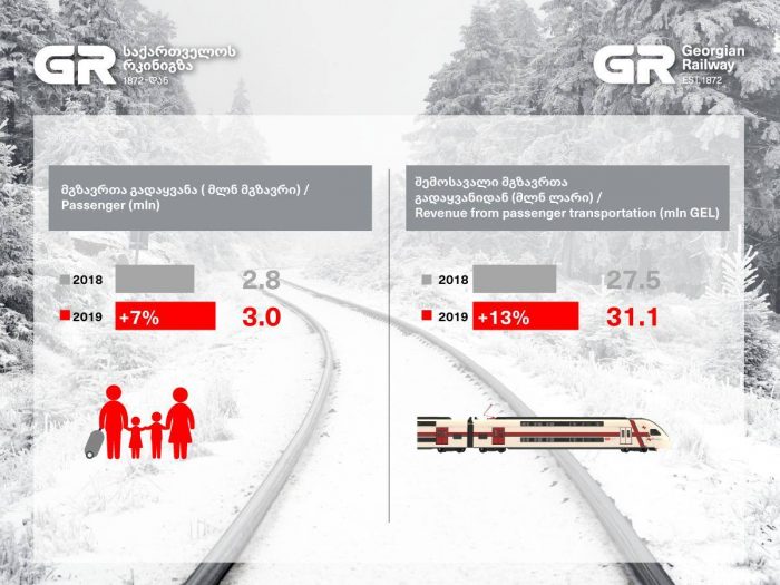 “2019 წელს სამგზავრო გადაყვანებში ისტორიული მაჩვენებლები დაფიქსირდა – საქართველოს რკინიგზის მეშვეობით გადაყვანილია 3 მილიონზე მეტი მგზავრი. შემოსავალმა კი 31 მილიონ ლარს გადააჭარბა”,-ნათქვამია საქართველოს რკინიგზის მიერ გავრცელებულ განცხადებაში.