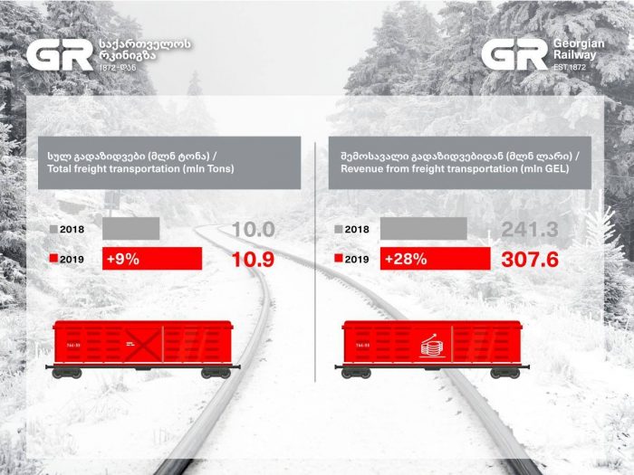 “საქართველოს რკინიგზის” მიერ 2019 წელს გადაზიდული ტვირთი თითქმის 1 მილიონი ტონით აღემატება 2018 წლის მონაცემებს