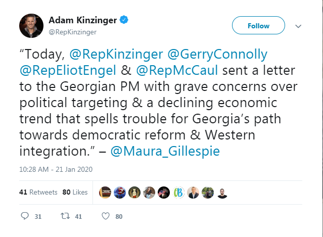 „დღეს საქართველოს პრემიერ-მინისტრს ოფიციალური წერილით მივმართეთ მე, ჯერი კონოლიმ, ელიოტ ენგელმა და მაიკლ მაკაულმა. ამ წერილში გამოვთქვით შეშფოთება პოლიტიკური ნიშნით მიზანში ამოღებისა და დაღმავალი ეკონომიკური ტენდენციების გამო, რაც პრობლემებს უქმნის საქართველოს გზას დემოკრატიული რეფორმებისა და დასავლეთთან ინტეგრაციისკენ“, – ნათქვამია ადამ კინზინგერის მიერ „ტვიტერის“ გვერდზე გამოქვეყნებულ განცხადებაში.