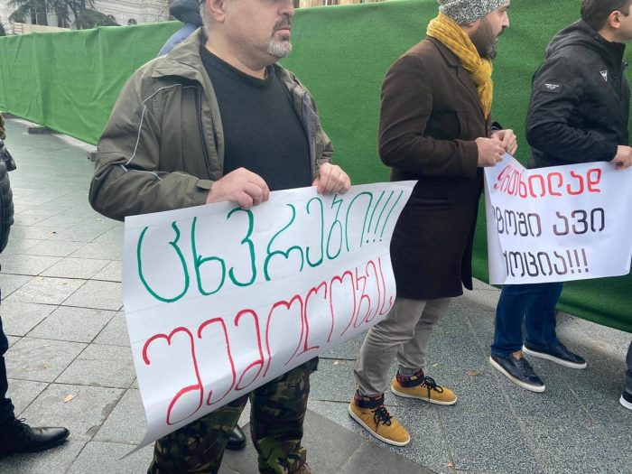 აქციის მონაწილეებს თან აქვთ პლაკატები წარწერებით: “ჩვენ, ხალხის გვეშინია”, “ფრთხილად ეზოში ავი ქოცია”.