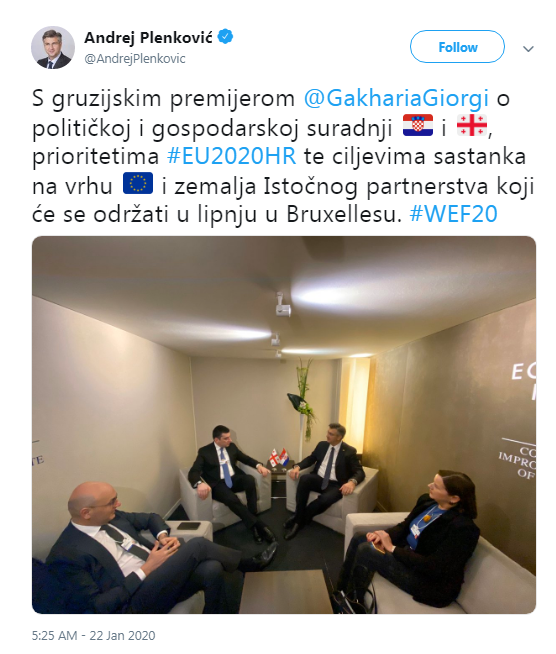 საქართველოს პრემიერ-მინისტრ გიორგი გახარიასთან დავოსში გამართულ შეხვედრას ხორვატიის პრემიერი ანდრეი პლენკოვიჩი სოციალურ ქსელ “ტვიტერში” საკუთარ გვერდზე ეხმაურება.