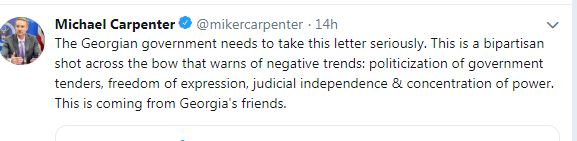 საქართველოს მთავრობა კონგრესმენების წერილს სერიოზულად უნდა მიუდგეს, – ამის შესახებ პენსილვანიის უნივერსიტეტში ჯო ბაიდენის ანალიტიკური ცენტრის დირექტორმა, მაიკლ კარპენტერმა “ტვიტერზე” დაწერა.