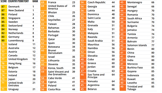 ახალი ინდექსის თანახმად, ყველაზე კორუმპირებული ქვეყნებია სომალი, სამხრეთ სუდანი და სირია. ყველაზე არაკორუმირებულ ქვეყნებში კი დანია, ახალი ზელანდია და ფინეთი ლიდერობენ.
