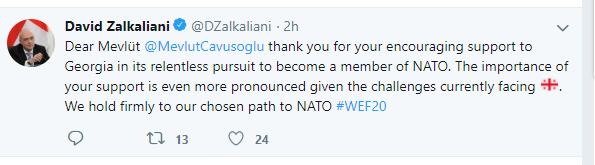 თურქეთის საგარეო საქმეთა მინისტრმა დავოსში ეკონომიკურ ფორუმზე NATO-ს გაფართოების საჭიროებაზე ისაუბრა და აღნიშნა, რომ საქართველო ალიანსის წევრი უნდა გახდეს. „არ მესმის, რატომ არ მივიწვიეთ საქართველო ორგანიზაციაში, ან რატომ არ გავააქტიურეთ სამოქმედო გეგმა, რომ ის ჩვენი წევრი გახდეს. ჩვენ გვაკრიტიკებენ რუსეთთან, როგორც მეზობელთან, შედარებით კარგი ურთიერთობისთვის, თუმცა ჩვენი დასავლელი მეგობრები არ ეთანხმებიან საქართველოს მიწვევას, რადგან მათ არ სურთ, რუსეთის პროვოცირება. თუმცა, საქართველოს ჩვენ ვჭირდებით და ჩვენ გვჭირდება საქართველოსნაირი მოკავშირე. ამიტომ, ჩვენ გვჭირდება გაფართოება და საქართველო უნდა გახდეს ნატოს წევრი“, – განაცხადა ჩავუშოღლუმ.