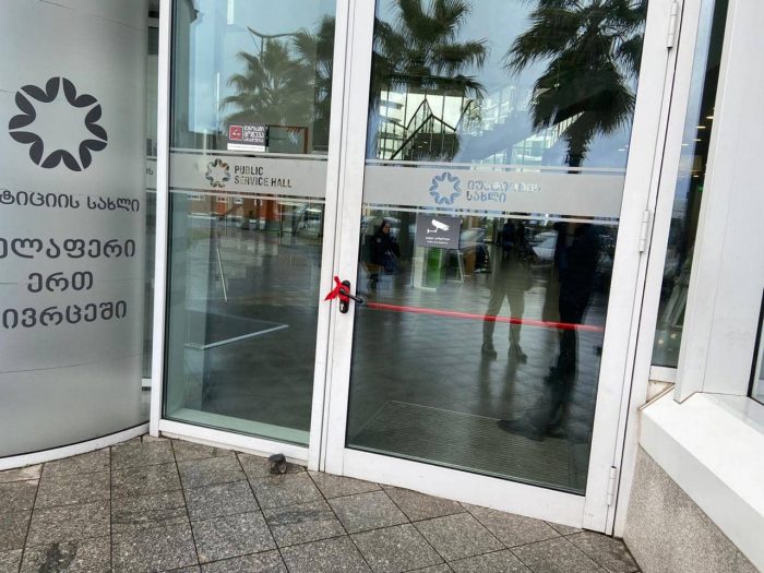 აქცია-პერფორმანსი ბათუმში – აქტივისტებმა იუსტიციის სახლის კარს წითელი ყელსახვევები შეაბეს