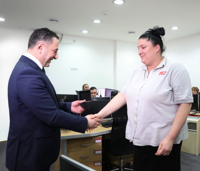 შინაგან საქმეთა მინისტრი საზოგადოებრივი უსაფრთხოების მართვის ცენტრ 112-ს ეწვია. ვახტანგ გომელაური ცენტრის თანამშრომელს, 2019 წლის საუკეთესო დისპეტჩერს, სალომე ბასილაძეს სამსახურებრივი მოვალეობის შესრულების დროს შეხვდა და მისთვის მოულოდნელად, გაწეული ეფექტიანი საქმიანობისთვის სპეციალური მედალიონით დააჯილდოვა.